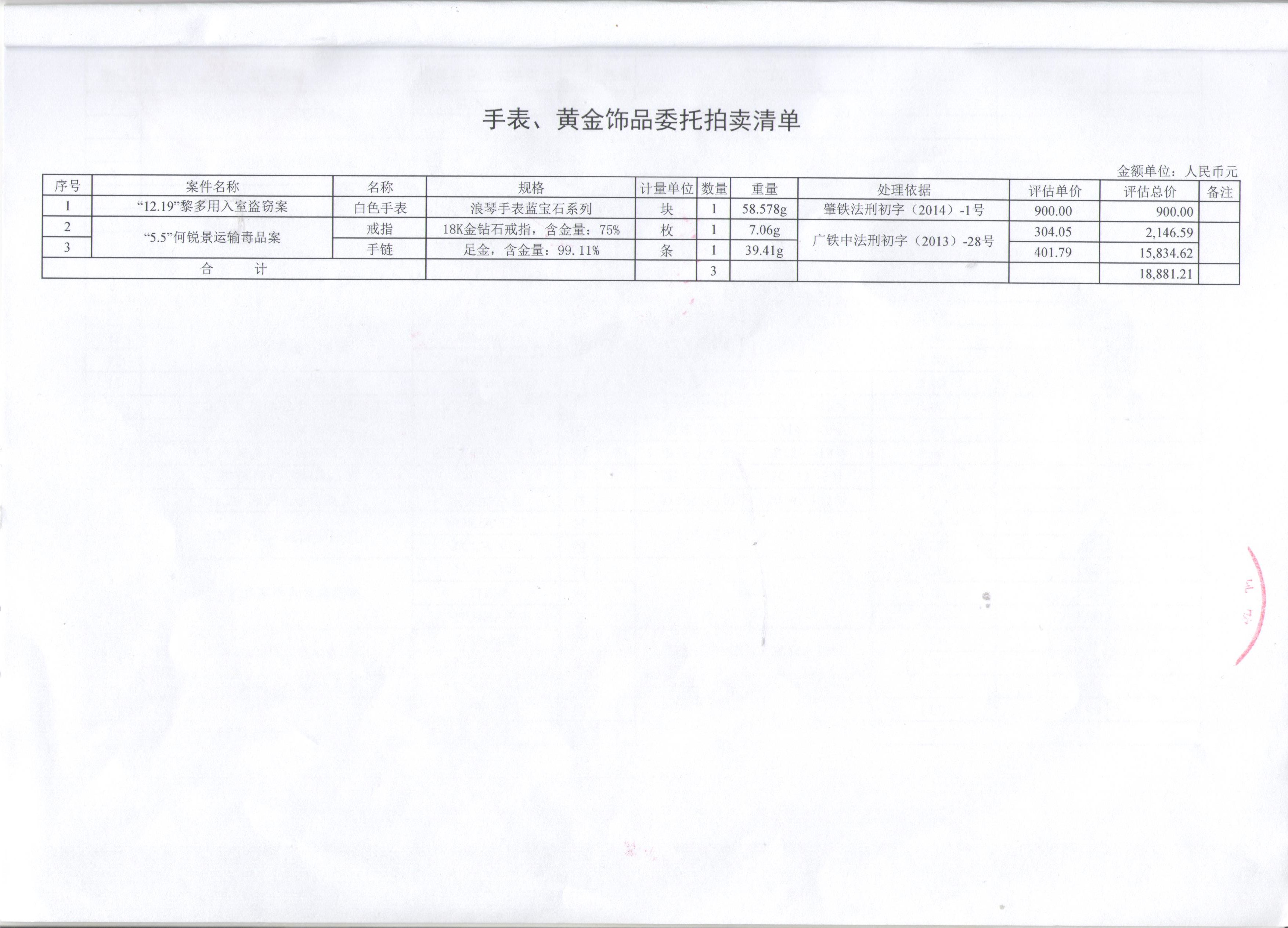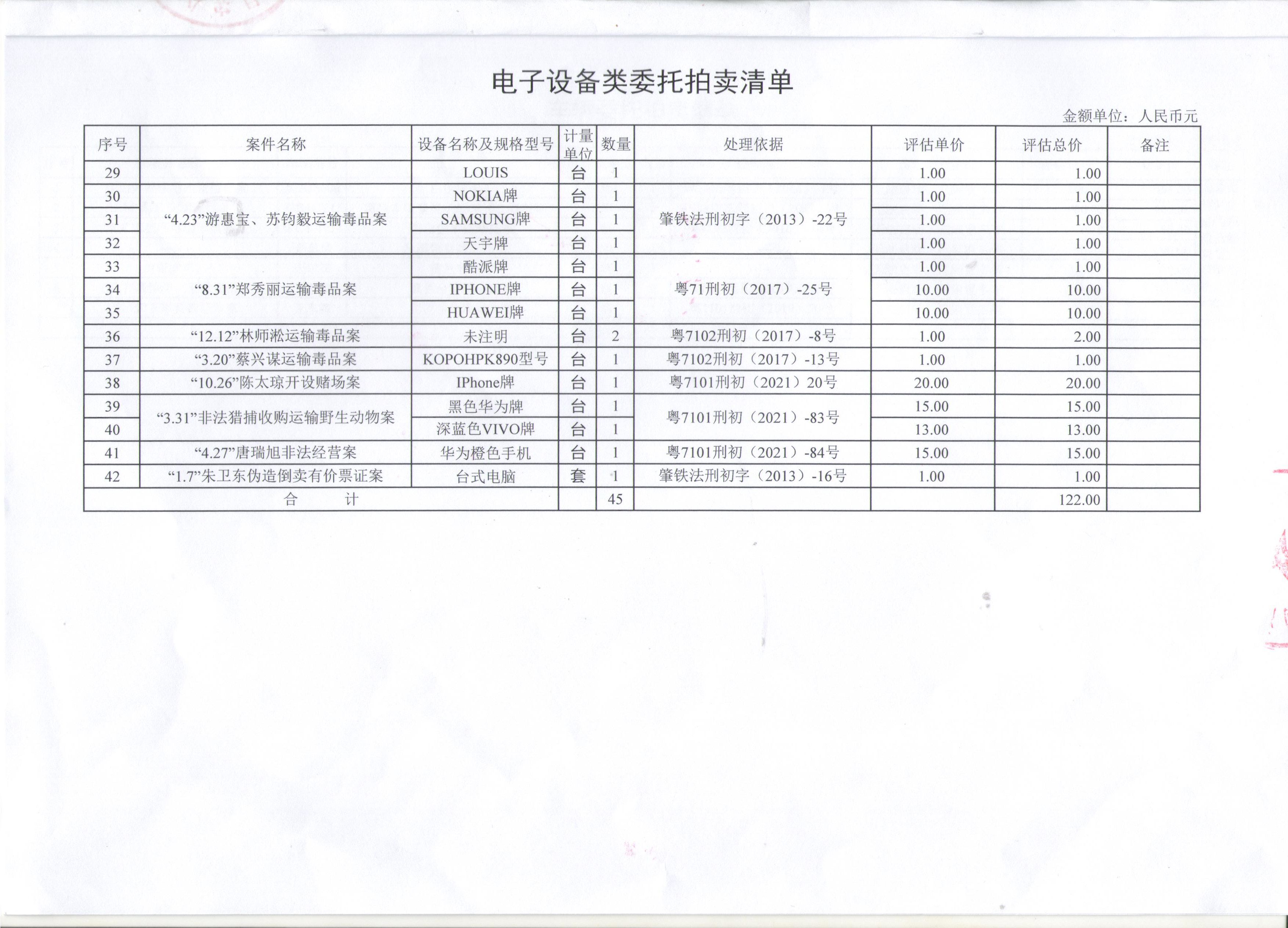 受委托,定于2023年1月18日15:00在我司拍卖厅公开拍卖:罚没的56件涉案物品及其它附件(电子设备、车辆、手表、黄金饰品),详见拍卖清单。